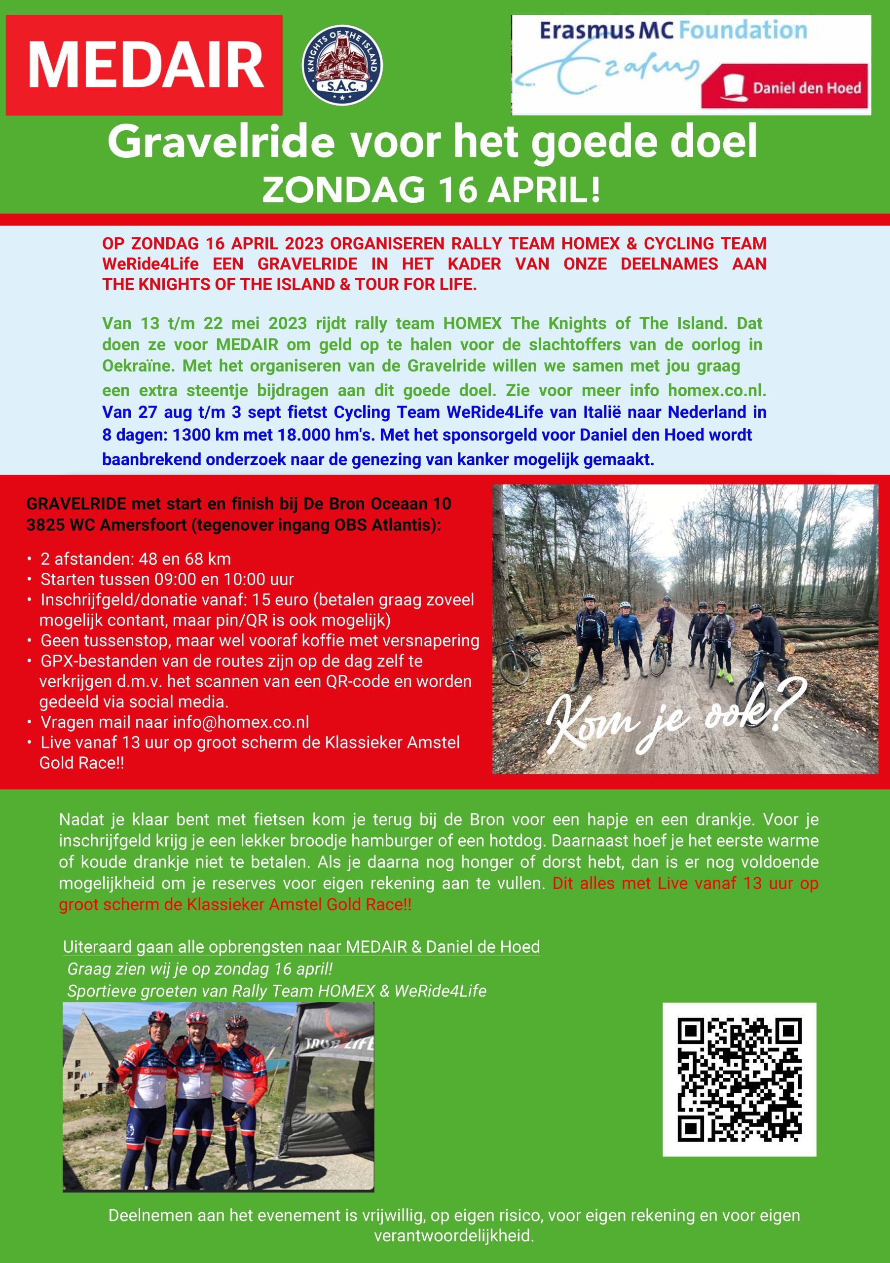 OP ZONDAG 16 APRIL 2023 ORGANISEREN RALLY TEAM HOMEX & CYCLING TEAM WeRide4Life EEN GRAVELRIDE IN HET KADER VAN ONZE DEELNAMES AAN THE KNIGHTS OF THE ISLAND & TOUR FOR LIFE.